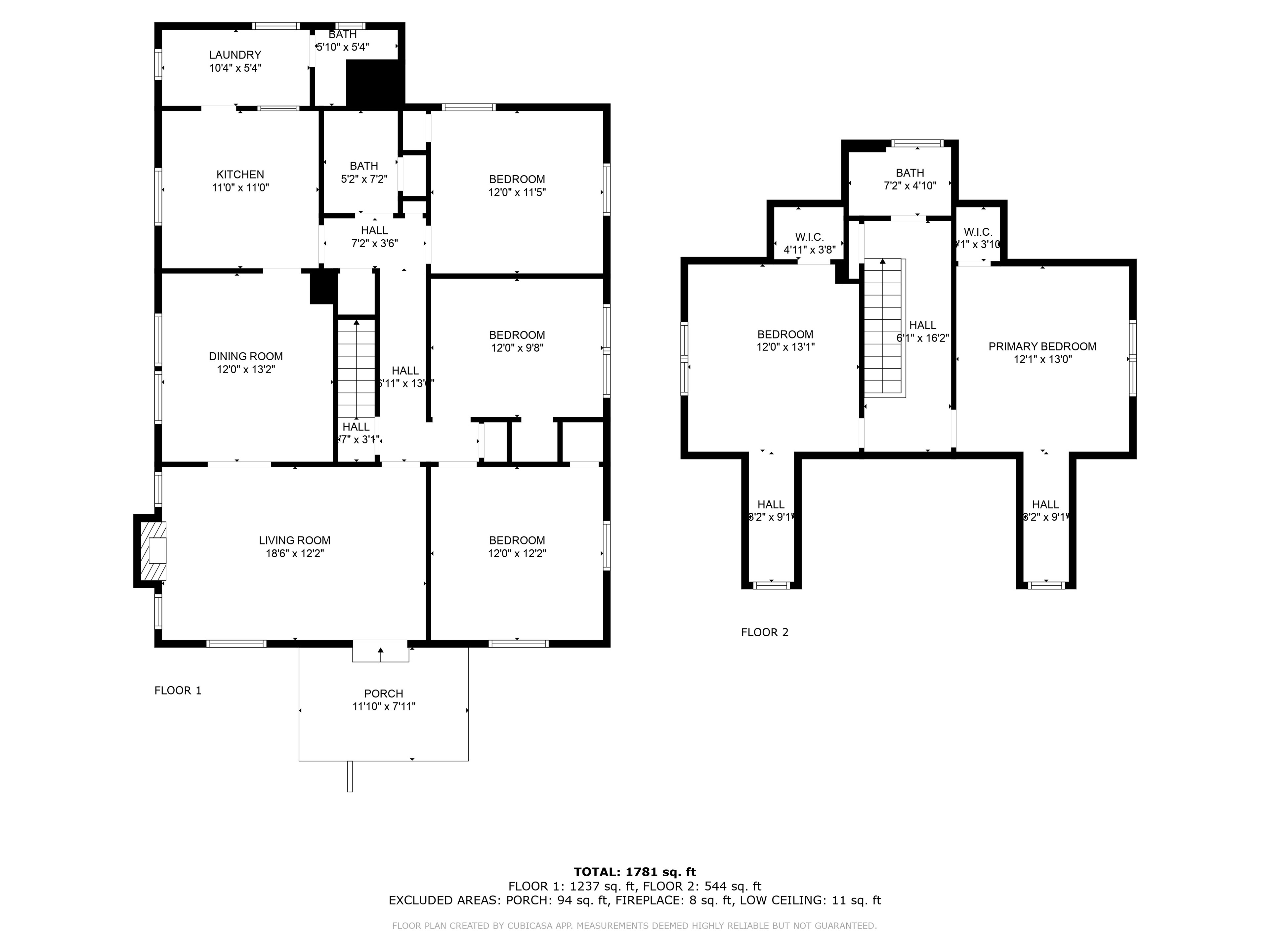 TOTAL: 1781 sq. ft FLOOR 1: 1237 sq. ft, FLOOR 2: 544 sq. ft EXCLUDED AREAS: PORCH: 94 sq. ft, FIREPLACE: 8 sq. ft, LOW CEILING: 11 sq. fl
